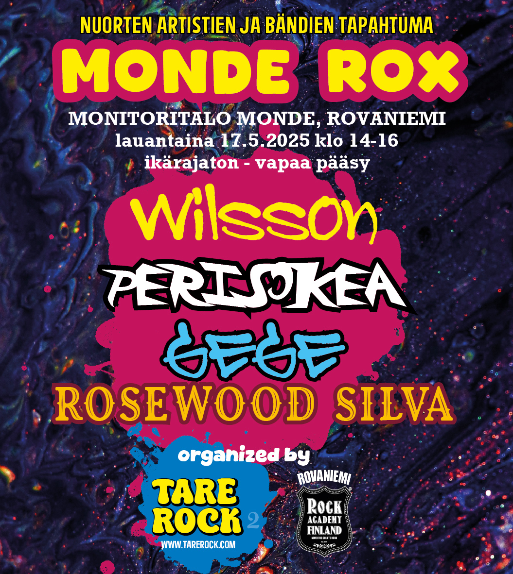 Tare Rock 2 festivaalin yhteydessä lauantaina 17.5.2025 päivällä klo 14-16 monitoritalo Mondella esiintyy nuoria artisteja. Lavalle nousee kaksi hip-hop artistia ja kaksi metallibändiä. Esiintyjät ovat Wilsson, Gege, Perisokea ja Rosewood Silva. Monderox tapahtuma on ikärajaton ja pääsymaksuton. Järjestäjinä ovat yhteistyössä Tare Rock -festivaali ja Rovaniemi Rock Academy.